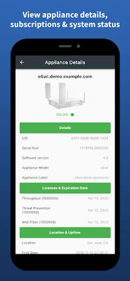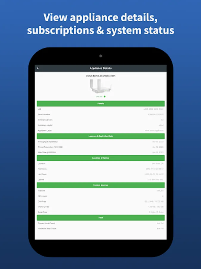 - Review appliance specific information including software version, license, location, system resources and uptime details.