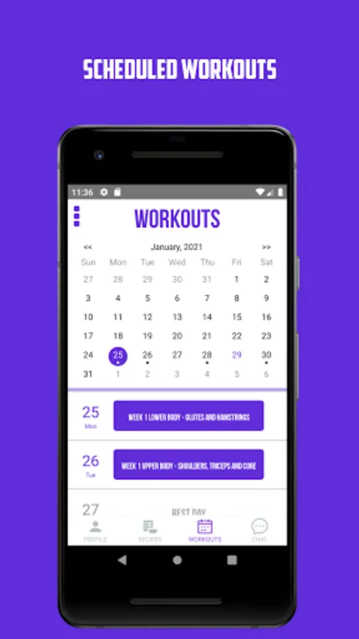 - View your upcoming workouts on your personal training calendar. Track your weights, sets and reps to ensure that you are making frequent progressions towards your goal.
