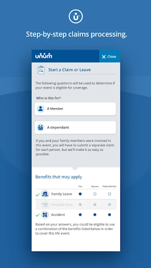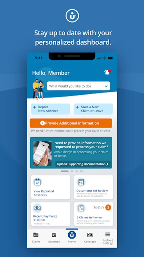 The MyUnum for Members mobile app walks you through the claim or leave process. Enjoy 24/7 access to your personalized benefits dashboard, opt to receive faster approved payments with direct deposit, and check the status of existing claims or leave submissions anytime, anywhere.