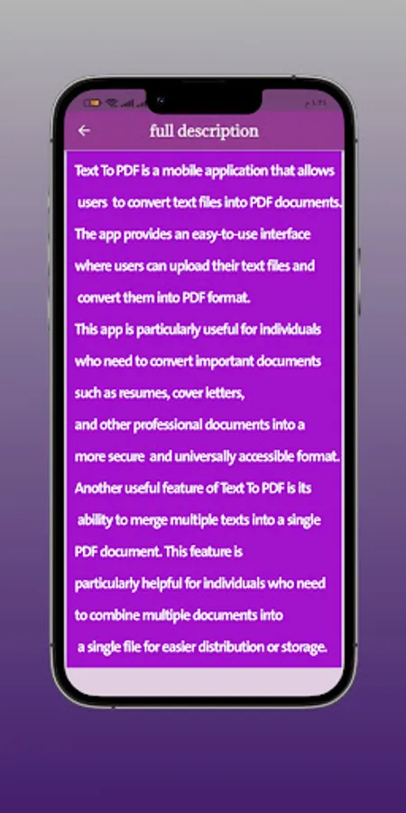 Text To PDF is a mobile application that allows users to convert text files into PDF documents. The app provides an easy-to-use interface where users can upload their text files and convert them into PDF format. This app is particularly useful for individuals who need to convert important documents such as resumes, cover letters, and other professional documents into a more secure and universally accessible format.