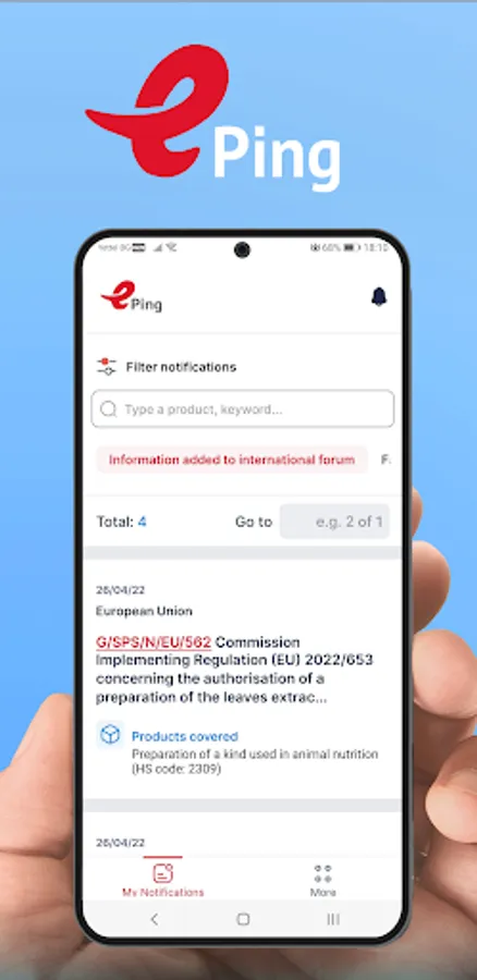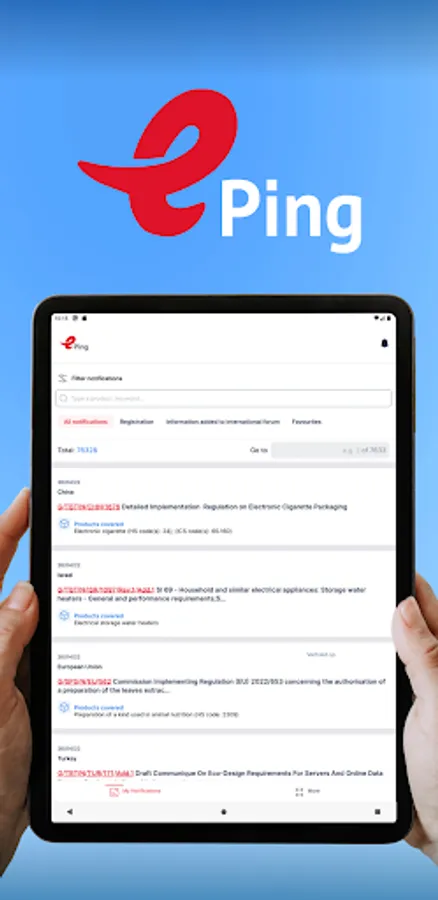 Want to stay abreast of upcoming changes in product requirements in your export markets? ePing can help! Use the ePing application to browse updates on product requirements of the 164 WTO countries/territories. Once you have subscribed on the ePing website (www.epingalert.org) indicating markets and products of interest to you, you can log into the app on your smartphone or tablet to receive personalized information on these new requirements.