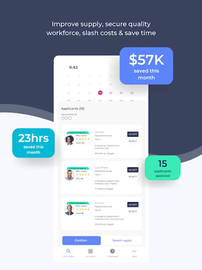 Instantly fill casual healthcare shifts, term contracts and permanent placements. Try-before-you-buy and seamlessly transition casual talent to your permanent workforce.