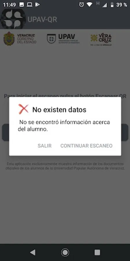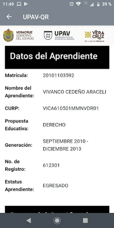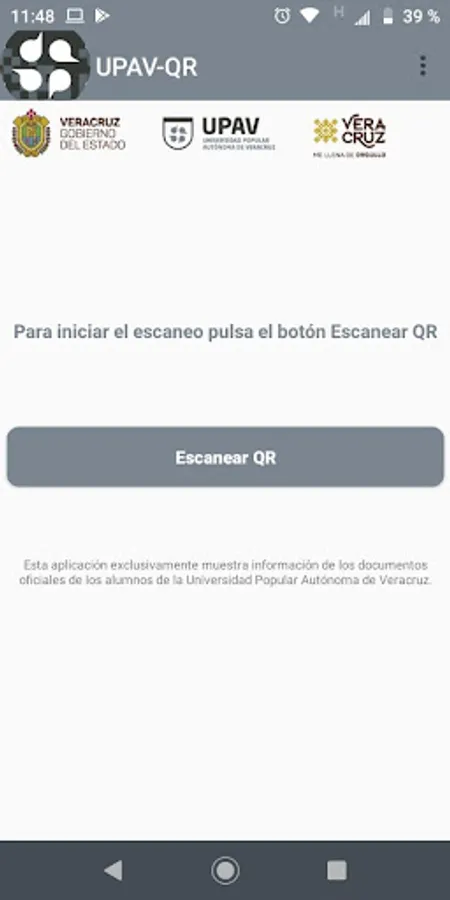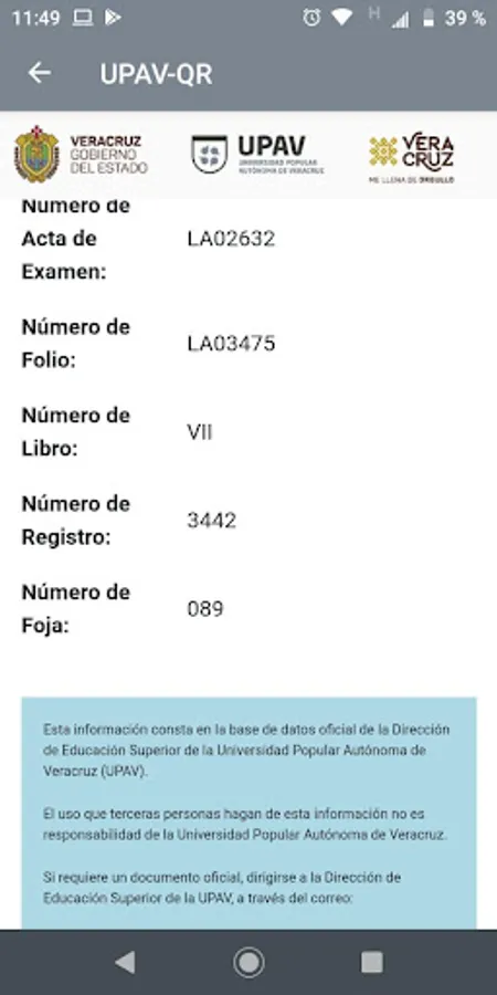 UPAV-QR is a tool that allows authenticating the documents issued by the Directorate of Higher Education of the Popular Autonomous University of Veracruz, in which the student's information and the documents obtained that accredit their level of studies are displayed, such as the Certificate and Professional Title, if the student does not have documents issued at the time of reading the QR, an informative message will be displayed.