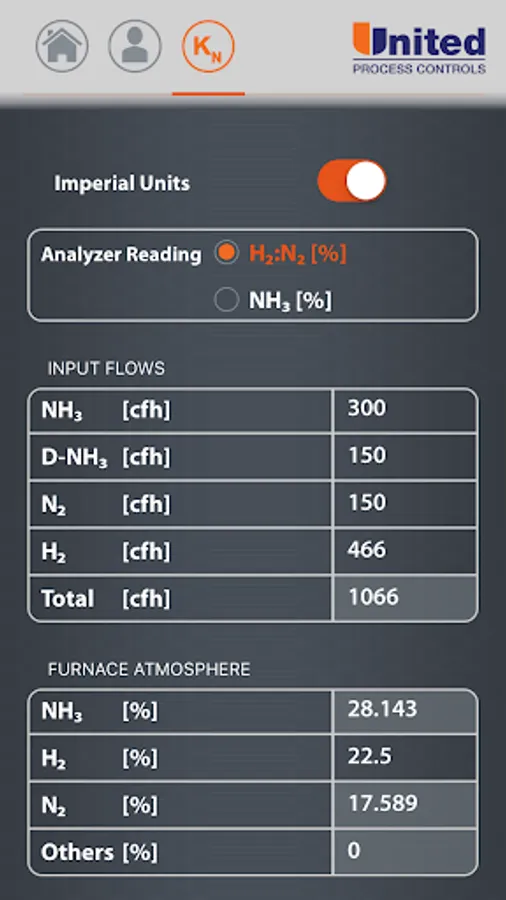 Calculates the furnace atmosphere composition, nitriding potential, water burette reading and dissociation degree (alpha) based on input flows – ammonia, dissociated ammonia, nitrogen, and hydrogen – and readings of either a hydrogen or an ammonia analyzer.