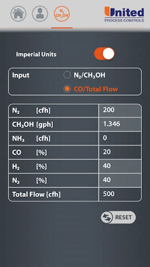 Allows calculation of flow rates and/or carbon monoxide percentage for a given total flow of carrier gas provided by a direct injection system for nitrogen-methanol mixtures. Includes a special feature that allows to observe the impact of ammonia addition on CO and H2 percentages.