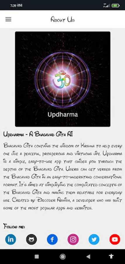 Bhagavad Gita contains the wisdom of Krishna to help every one live a peaceful, prosperous and virtuous life. Updharma is a simple, easy-to-use app that guides you through the depths of the Bhagavad Gita. Users can get verses from the Bhagavad Gita in an easy-to-understand conversational format. It's aimed at simplifying the complicated concepts of the Bhagavad Gita and making them relatable for everyday use. Created by Decoder Ashish, a developer who has built some of the most popular apps and websites.