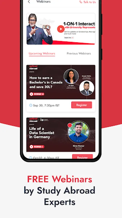 • Exclusive Study Abroad Webinars: Get real-time access to info on exclusive Scholarships, Program Launches & much more. Interact one-on-one with University representatives and clear all your doubts.