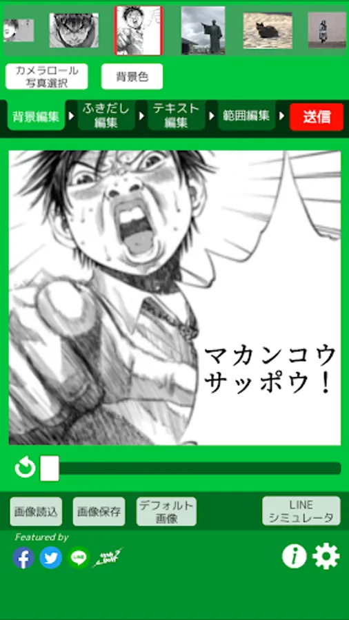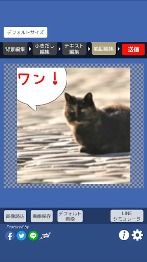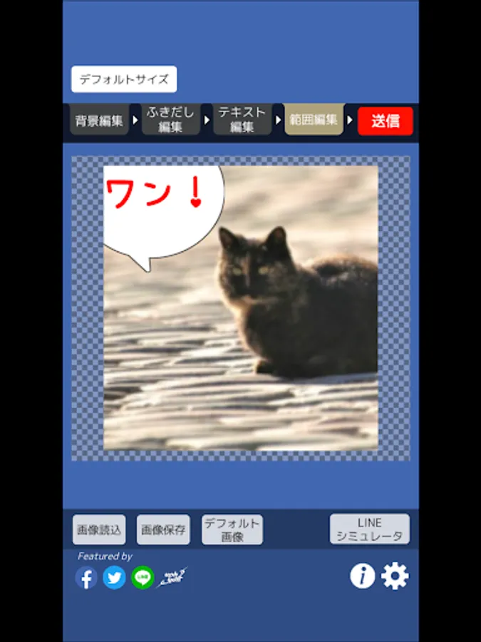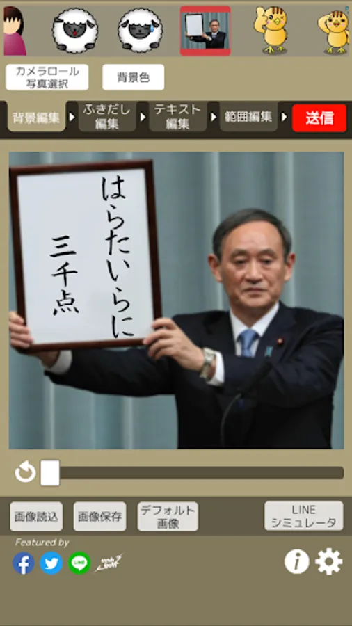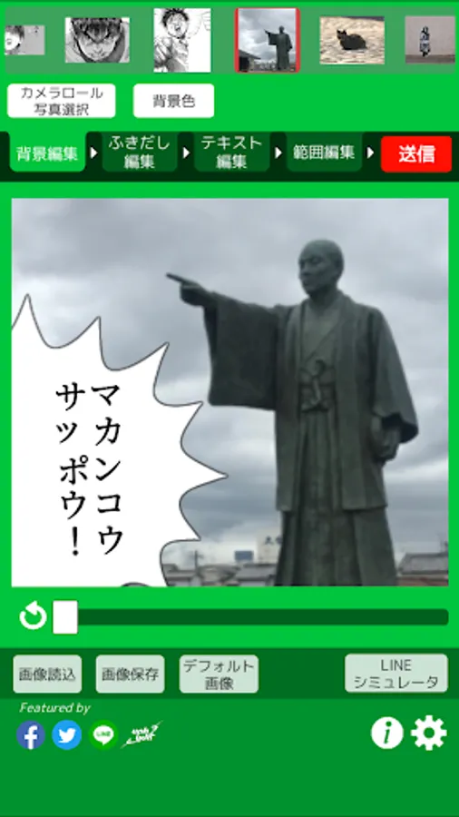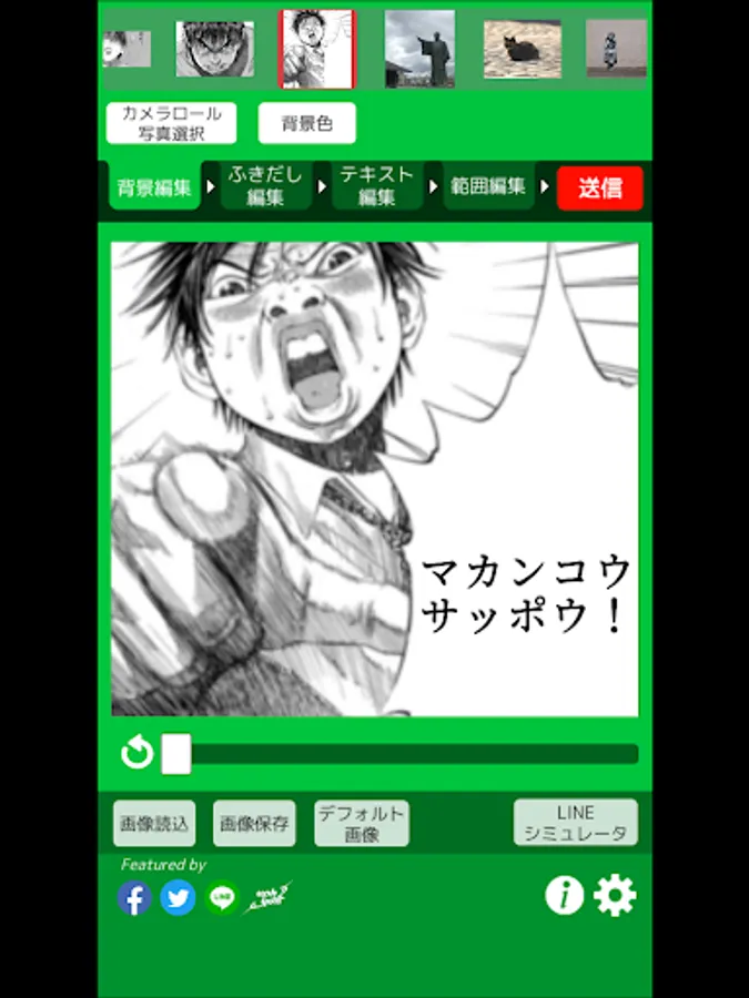 The created stamp image can be sent to LINE as well as posted on Twitter and Facebook.