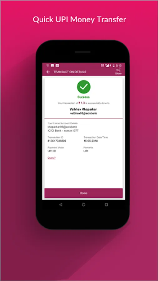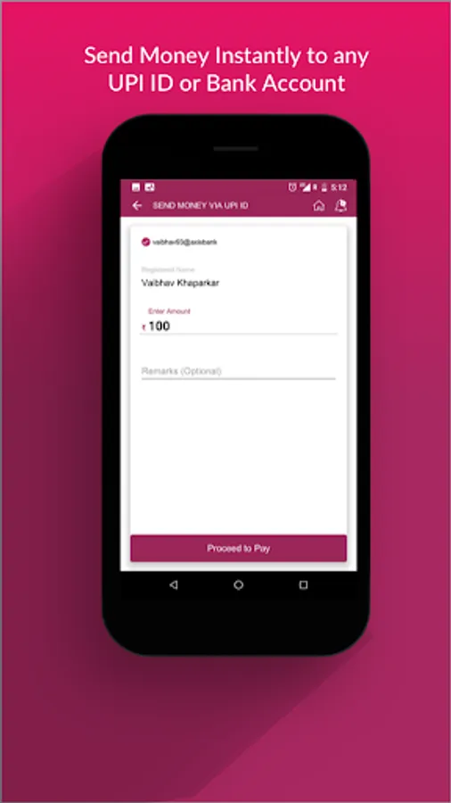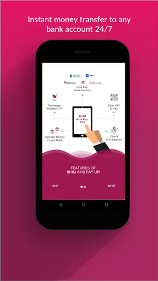 • UPI Payments,Instant Money Transfer: You can perform instant money transfer using UPI ID to any bank account right from BHIM Axis Pay money transfer app. You can link the beneficiaries just by using their UPI ID and transfer money from BHIM Axis Pay instantly at any time of the day without having to pay any transaction charges