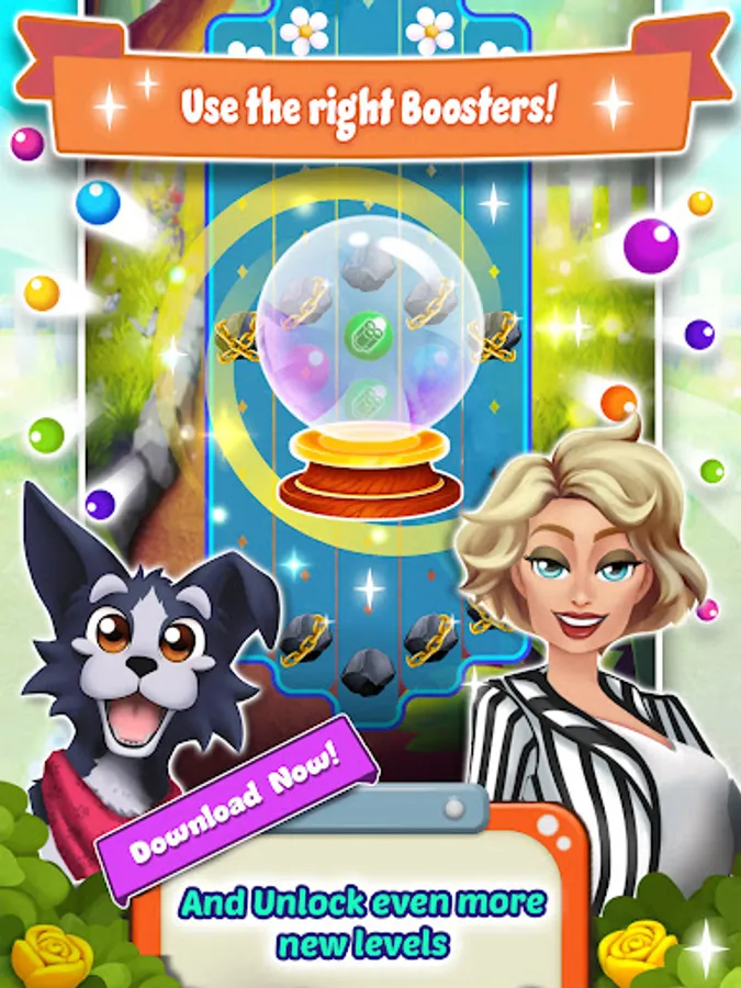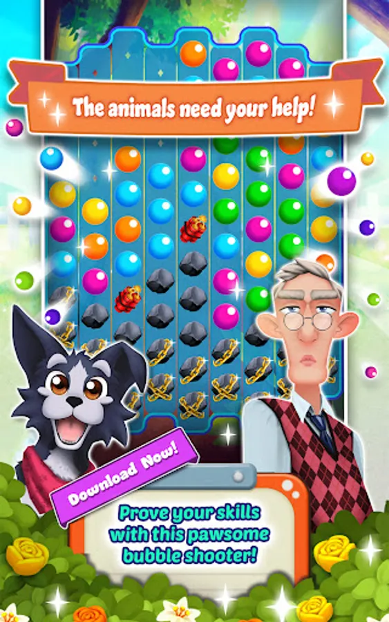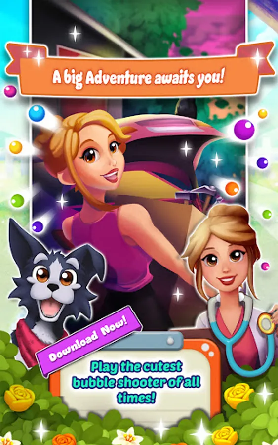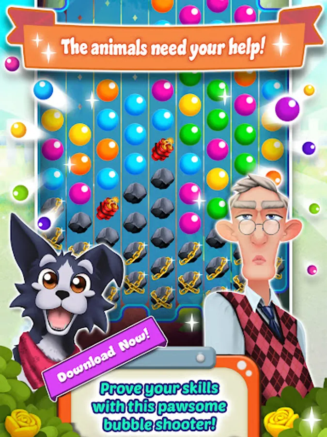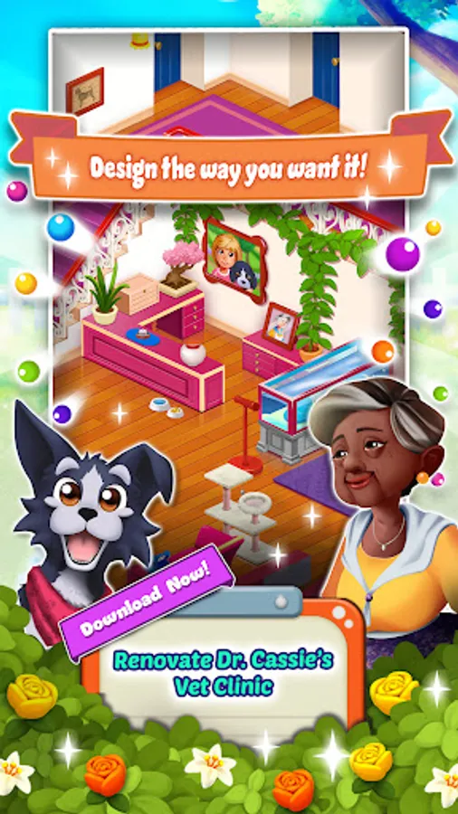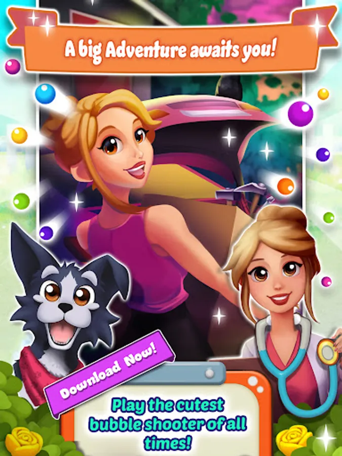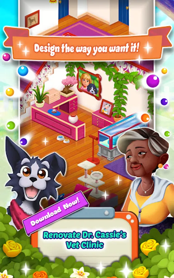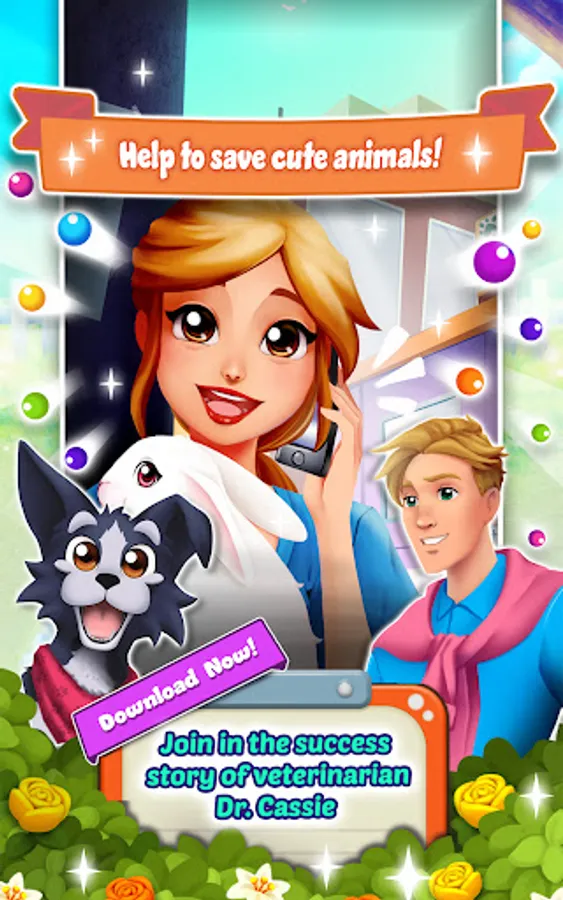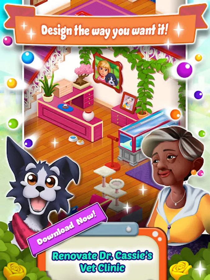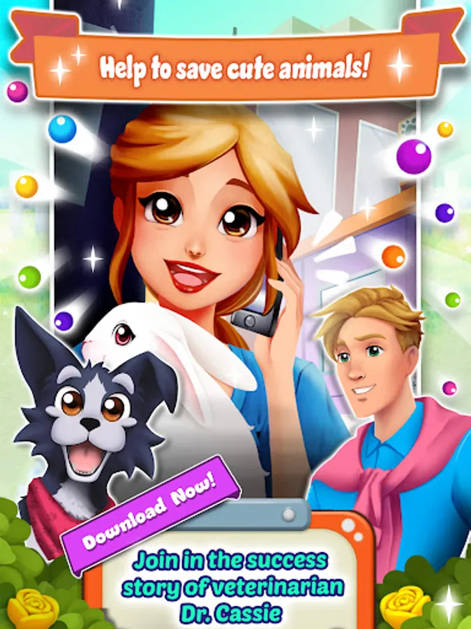 While you clear bubbles in the bubble game and renew the animal clinic as well as Dr. Cassie’s domestic premises, a lot is going on in the veterinarian’s private life. She encounters old acquaintances and also gets to know new interesting men. You can witness all of that the more you level up. So? Got curious? Then get the animalistic bubble shooter for your smartphone now.