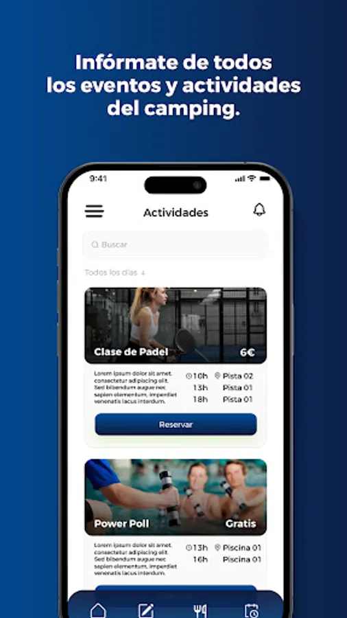 With our App you will have camping in your pocket. After registering your stay and choosing your language, you will gain access to all the resort's activities, services and products from a single site, through which you can easily make reservations and payments. In addition, you can request maintenance work, notify incidents and assess those services or activities in which you have participated. To live the complete camping experience, download our App!