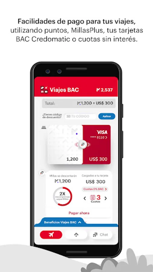 Pay partially or totally for your trips with Miles, and if they are not enough, combine them with your BAC Credomatic cards. You can also pay with 0% interest installments and thus live the adventure of your dreams.