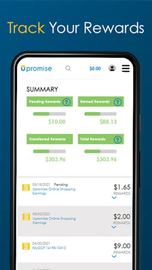 If you're already a Upromise member, you'll want to download the app. Rewards at your fingertips. Track your pending rewards, online store visits, and total rewards balance right from your phone.