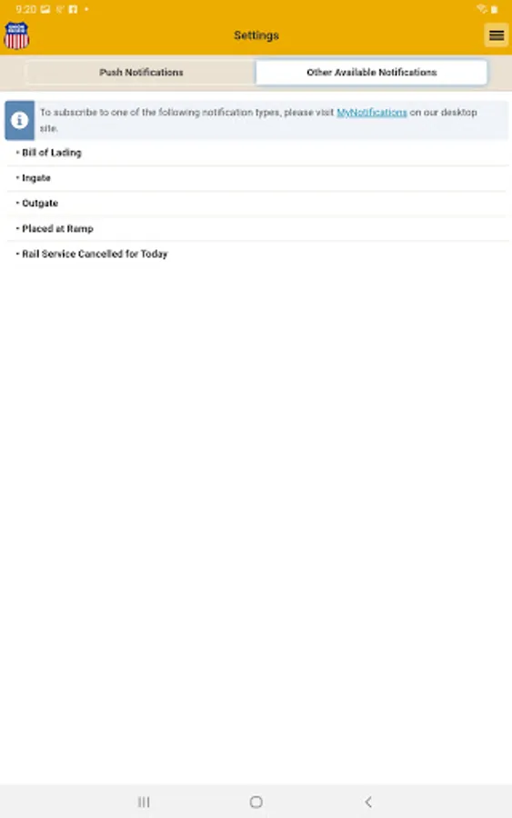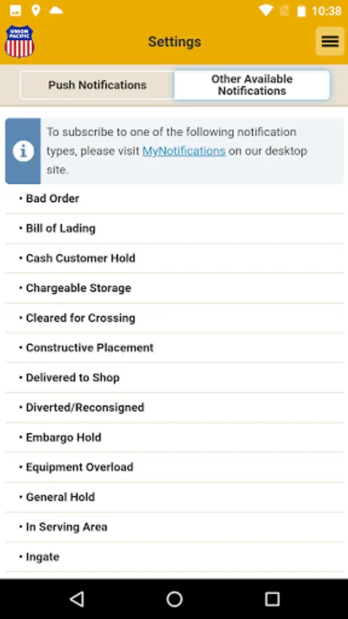 - Receive notifications regarding rail shipments (notification types include Bad Order, Chargeable