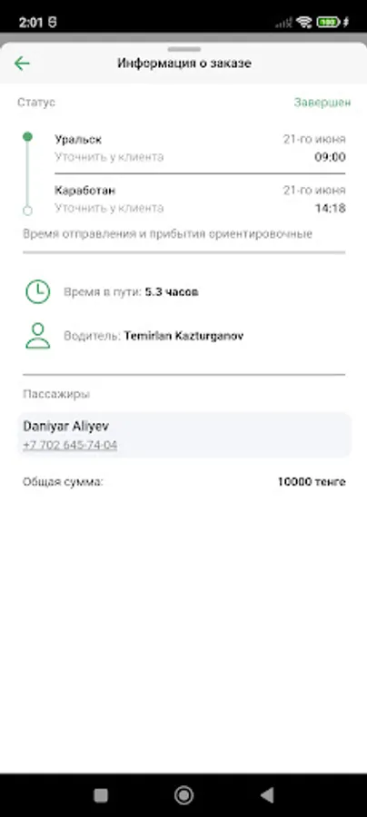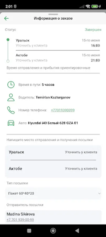 The application provides detailed information about each order, including the route, type of trip or package, contact details of the client, and delivery details. You can contact the client directly through the built-in communication tools if necessary.