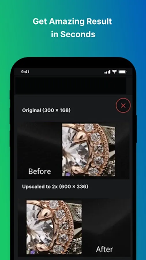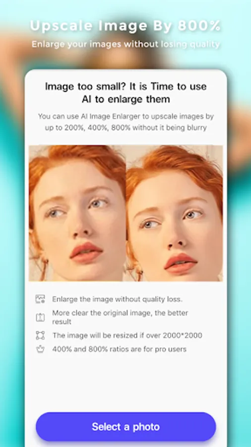 Upscale your photo and pictures by 200%, 400%, 800%,1600% without quality loss. Repair pixelated, blurry photos. Improve the photo quality and increase the resolution.