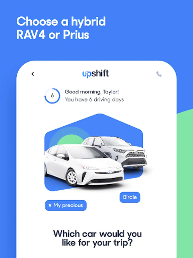 Upshift is a car club that empowers you to get access to a car quickly, simply, and comfortably. Members can swap between a hybrid RAV4 SUV or Prius, delivered whenever you need it. Our green fleet gets 40-54 MPG and comes with the latest autonomous vehicle technology - the practically drive and park themselves! We offer contactless delivery and sanitize cars between every trip.