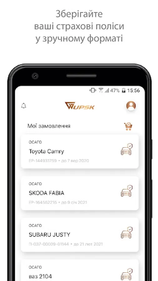 With our application you can buy a policy without leaving home, you do not need to carry a pile of documents or remember when the insurance policy expires. The automated system will remind you of the expiration of the policy.