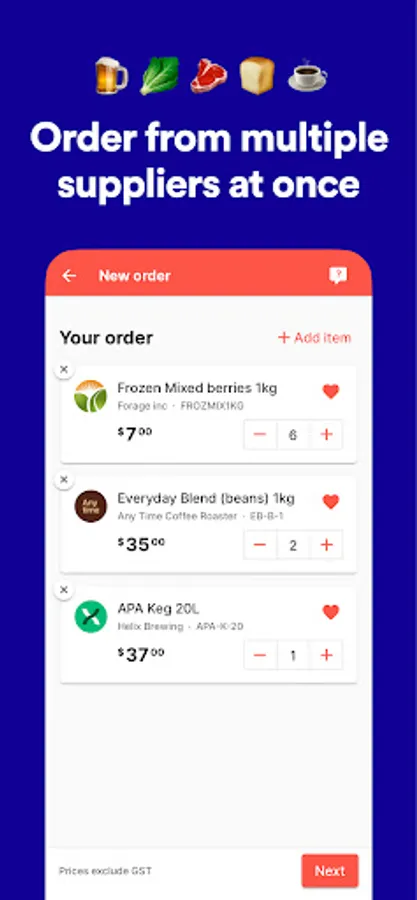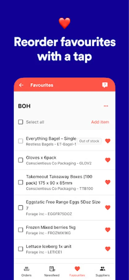 Save favourites to make it fast and easy to re-order, while being sure staff order exactly the right items, from the right suppliers.