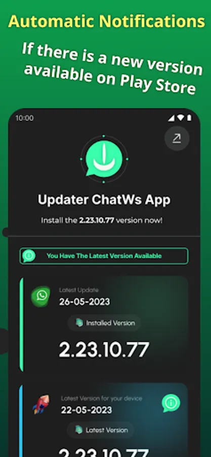 - Automatic notification app for check the latest ChatWs version in your phone.