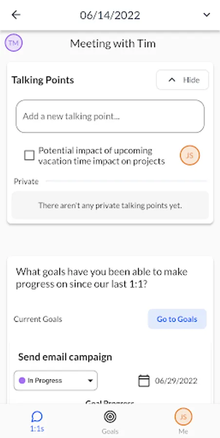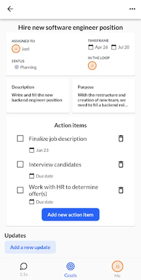 You can also work with your goals and your team's goals. Add goals, adjust timelines, and make updates to goals from the app.