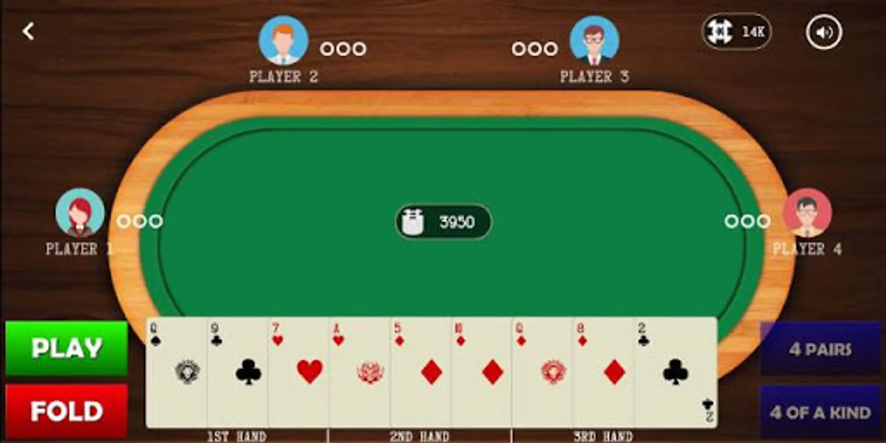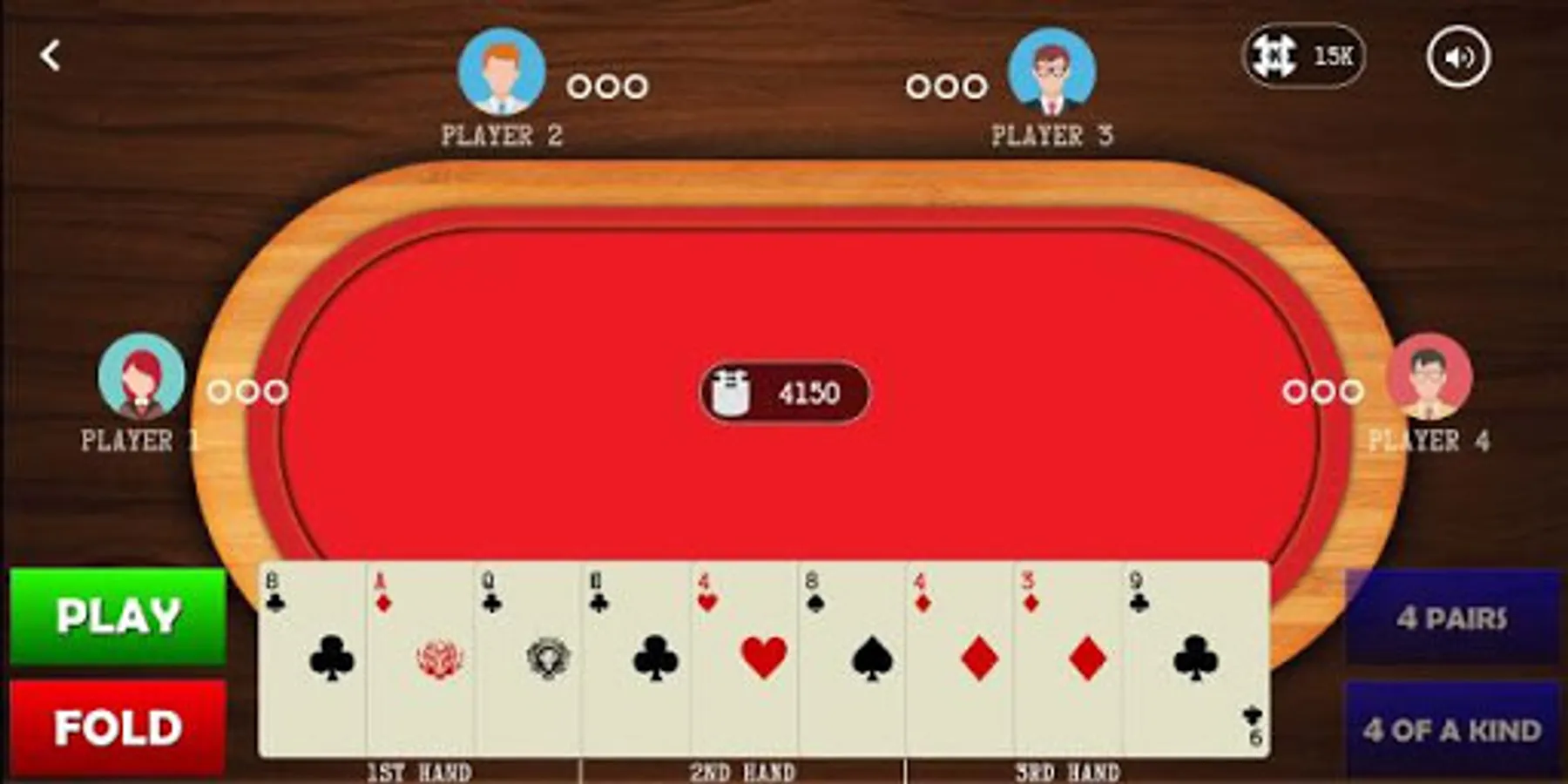 If you have any four of a kind, you win the hand immediately. If another player also has four of a kind, the player with the higher four of a kind wins. If you have four pairs you can “save the game” in which case user adds another stake to the pool and card are redealt.