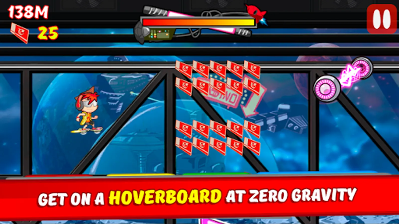 - Ride the incredible Hoverboard, is like a jetpack but to surf the space at zero gravity!