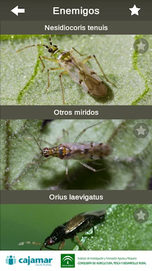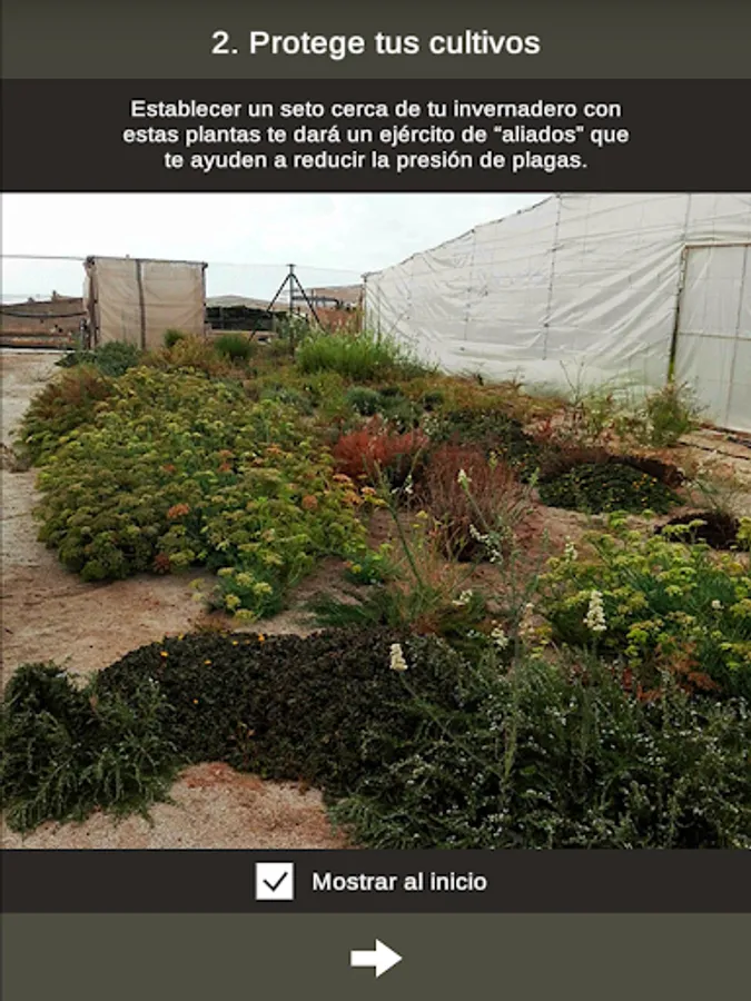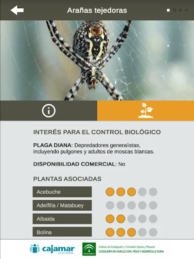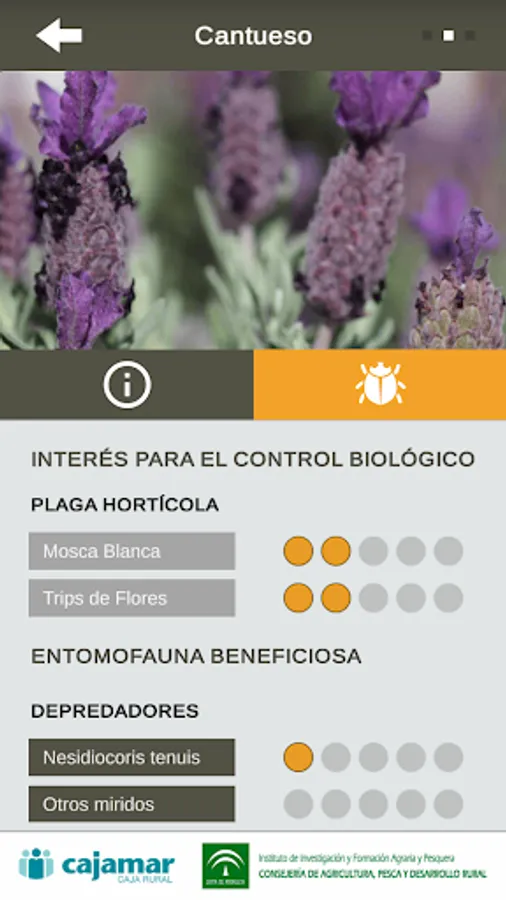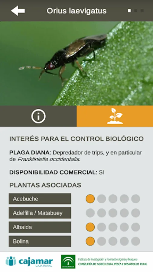 In this application a description of the characteristics of each plant is offered. the interest of the plant for biological control is also described, providing a list of those natural enemies observed in them for sampling and abundance. information about their attraction for two of the most important crop pests are also offered, such as whitefly (Bemisia tabaci) and thrips (Frankliniella occidentalis) that can reach shelter are. This APP can also be used to search for plants based on natural enemies that want to promote about your crops. It provides a description of the main natural enemies found in these plants, classified by functional groups: predators or parasitoids with a short description of the biology of the auxiliary, which is the plague that controls on which plants can be found and abundance.