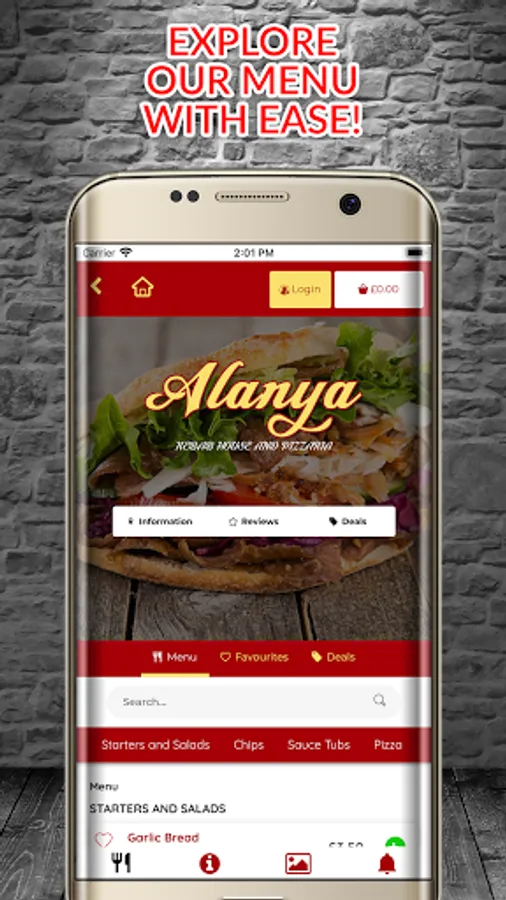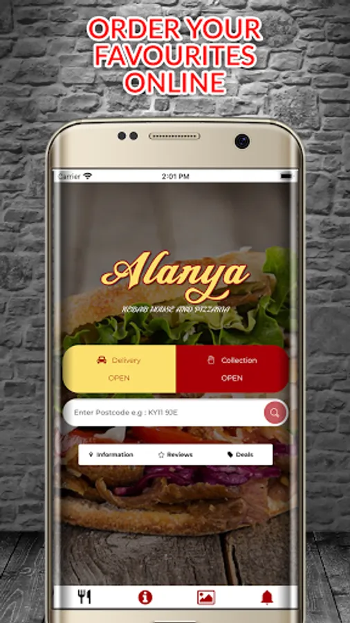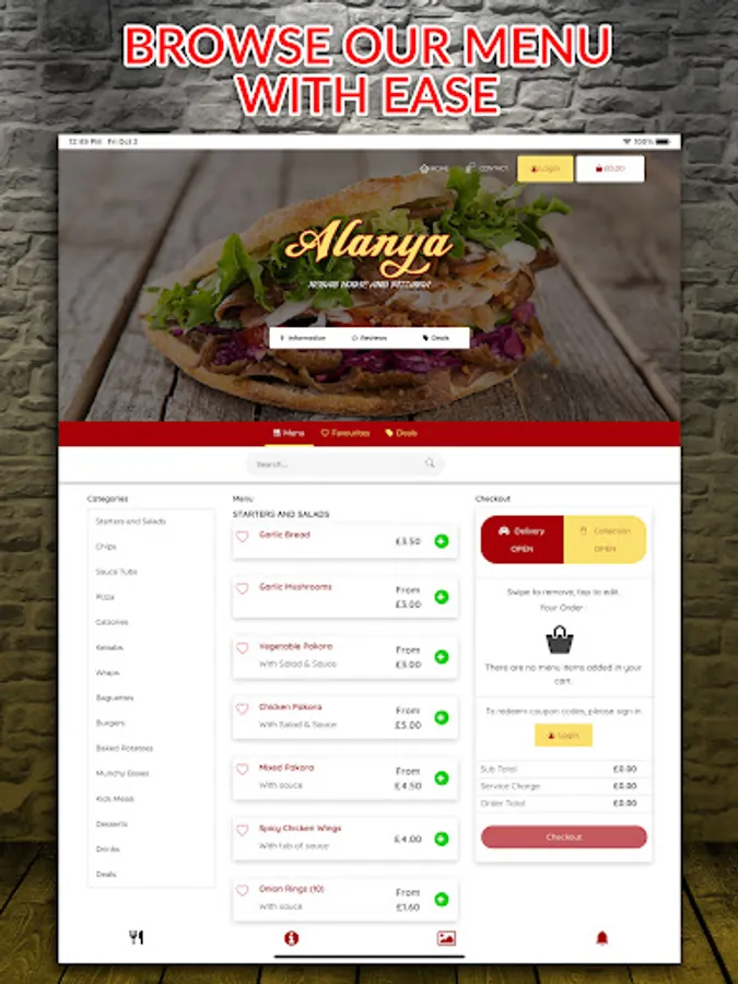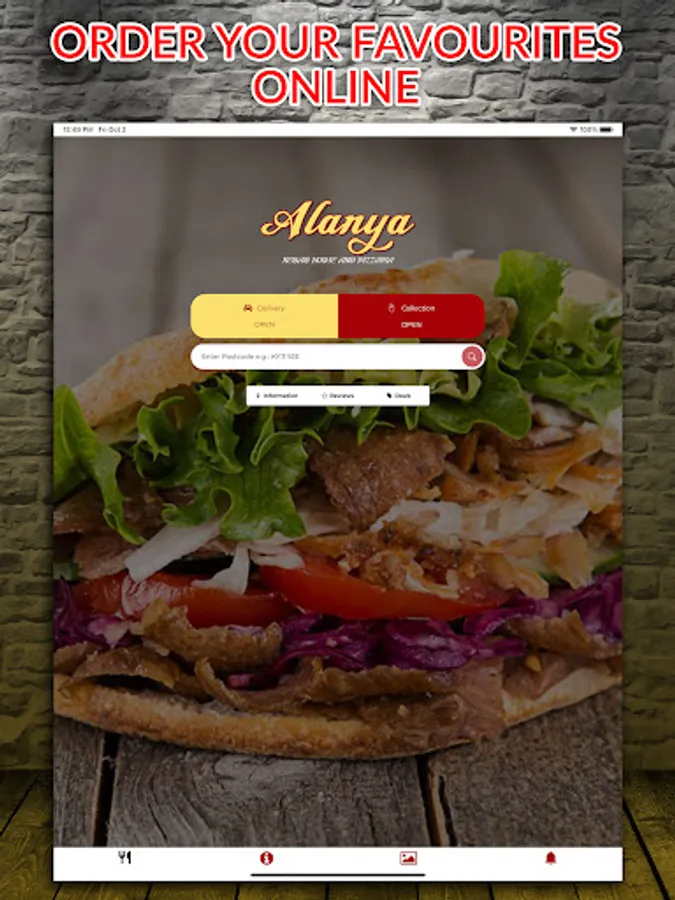 Order your food online using our new Alanya Kebab House application. Our easy to use mobile application allows you to view and order from our full menu. With collection and delivery available on the application our easy to use ordering system allows you to order food and pay online at your connivence from the comfort of your home. Our account functionality also allows you to reorder your favourite foods and receive exclusive offers and updates.