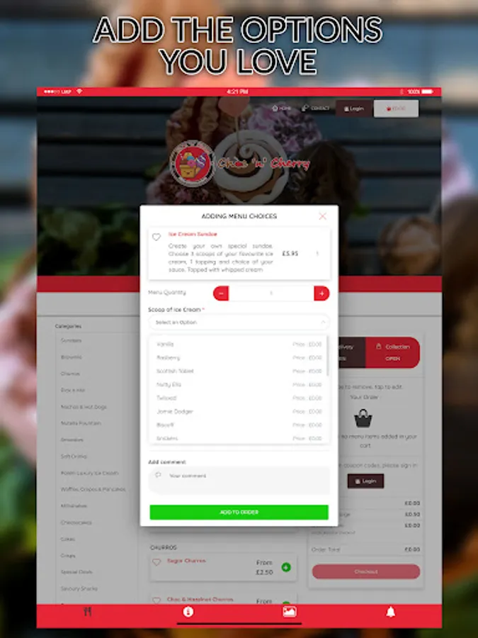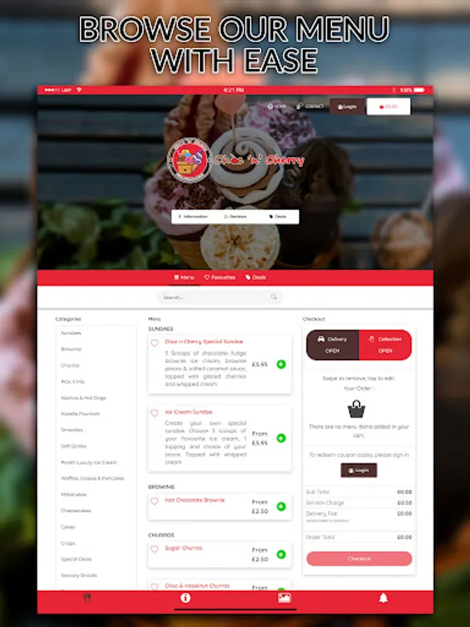 Order your favourites from Choc N Cherry online using our new app. With a delivery option available our easy to use system allows you to order and pay for your food from our full menu, all online and at your convenience from the comfort of your home. Alternatively, if you want to collect your order then you can do that too! You can also register for an account on the app, which will speed up future orders as well as allow you to reorder your favourite food easily. You can also receive exclusive offers and updates direct from us.