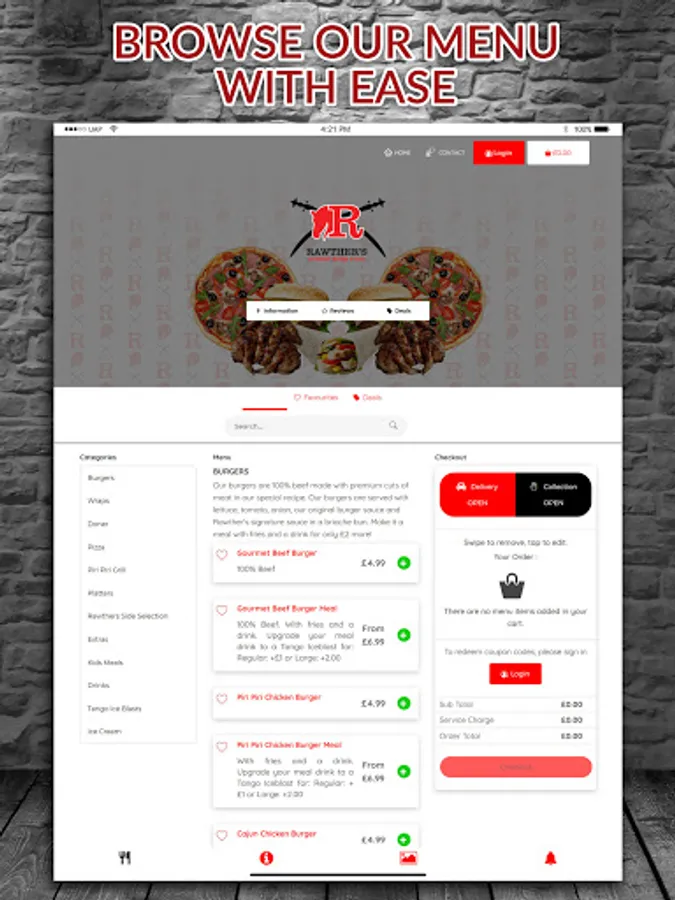 Order your favourite Rawthers food online using our new app. With a delivery option available our easy to use system allows you to order and pay for your food from our full menu, all online and at your convenience from the comfort of your home. Alternatively, if you want to collect your order then you can do that too! You can also register for an account on the app, which will speed up future orders as well as allow you to reorder your favourite food easily. You can also receive exclusive offers and updates direct from us.
