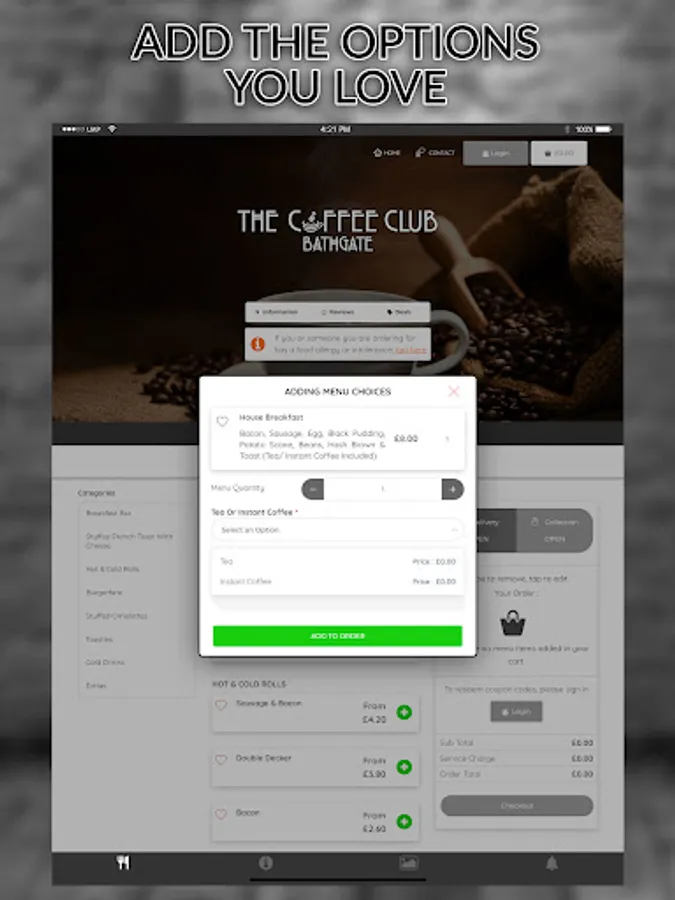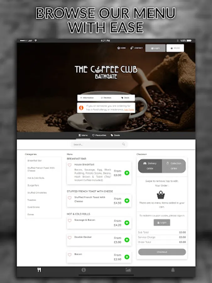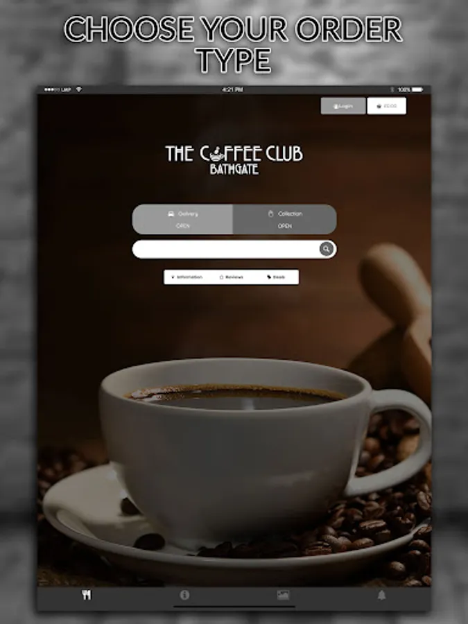 Order your favourites from The Coffee Club Bathgate online using our new app. With a delivery option available our easy to use system allows you to order and pay for your food from our full menu, all online and at your convenience from the comfort of your home. Alternatively, if you want to collect your order then you can do that too! You can also register for an account on the app, which will speed up future orders as well as allow you to reorder your favourite food easily. You can also receive exclusive offers and updates direct from us.