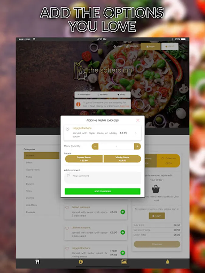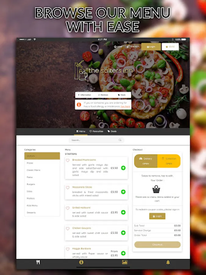 Order your favourites from The Salters Inn online using our new app. With a delivery option available our easy to use system allows you to order and pay for your food from our full menu, all online and at your convenience from the comfort of your home. Alternatively, if you want to collect your order then you can do that too! You can also register for an account on the app, which will speed up future orders as well as allow you to reorder your favourite food easily. You can also receive exclusive offers and updates direct from us.