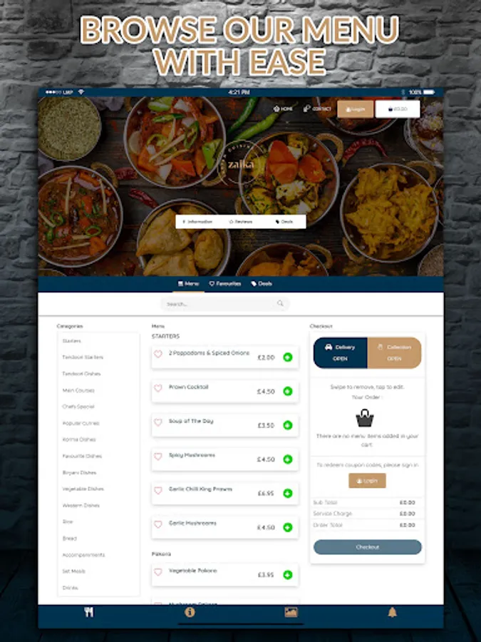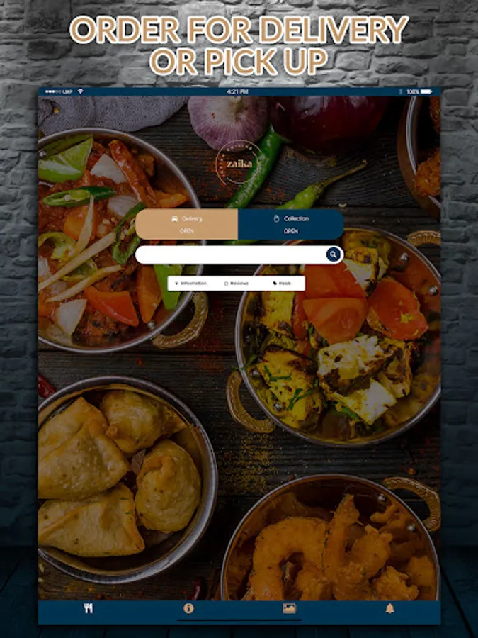 Order your favourite Zaika food online using our new app. With a delivery option available our easy to use system allows you to order and pay for your food from our full menu, all online and at your convenience from the comfort of your home. Alternatively, if you want to collect your order then you can do that too! You can also register for an account on the app, which will speed up future orders as well as allow you to reorder your favourite food easily. You can also receive exclusive offers and updates direct from us.