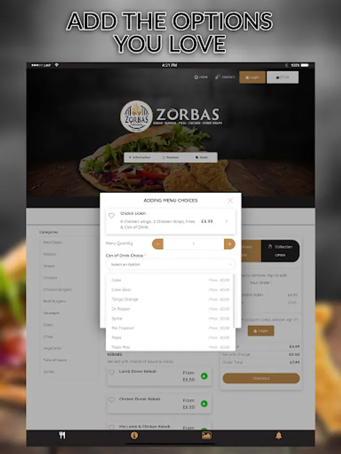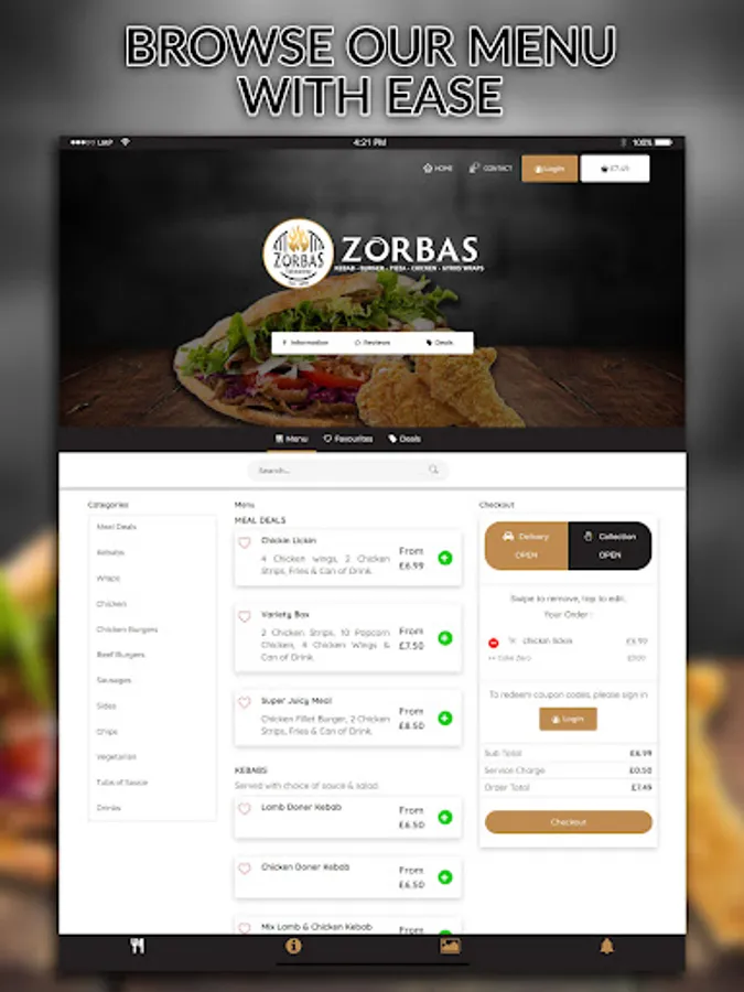 Order your favourites from Zorbas online using our new app. With a delivery option available our easy to use system allows you to order and pay for your food from our full menu, all online and at your convenience from the comfort of your home. Alternatively, if you want to collect your order then you can do that too! You can also register for an account on the app, which will speed up future orders as well as allow you to reorder your favourite food easily. You can also receive exclusive offers and updates direct from us.