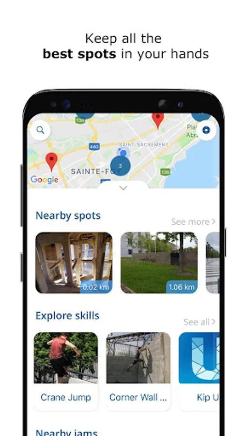 Use the chat to connect with other traceurs. Easily exchange tips, spots locations, moves and skills to achieve. See other Jumpers in your region with the “nearby traceurs” feature.