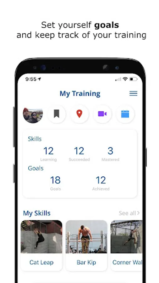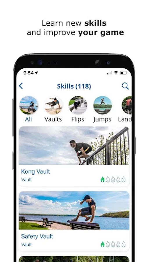 Have access to over 100 indexed skills. Each skill contains videos of how to perform it, prerequisites, a difficulty scale and a list of related skills. You can also see clips of other traceurs who achieved it. Keep track of your training by marking a skill as “learning”, “achieved” and “mastered”. You can also set yourself goals including skills plus a specific height and distance.
