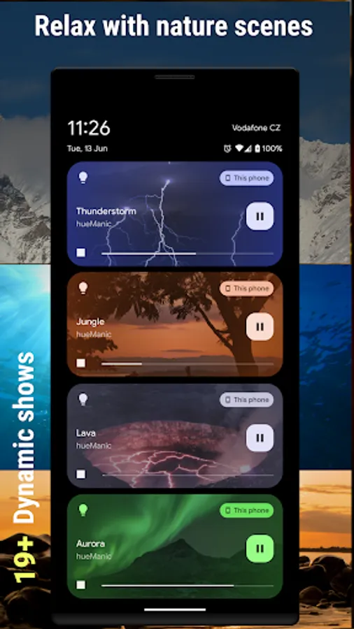 In the mood of a calm evening, hueManic will create a perfect illusion of a fireplace in your living room (especially great on Valentine's Day). Or get spooky on Halloween. Or just start a party with Disco effects reacting to your music!