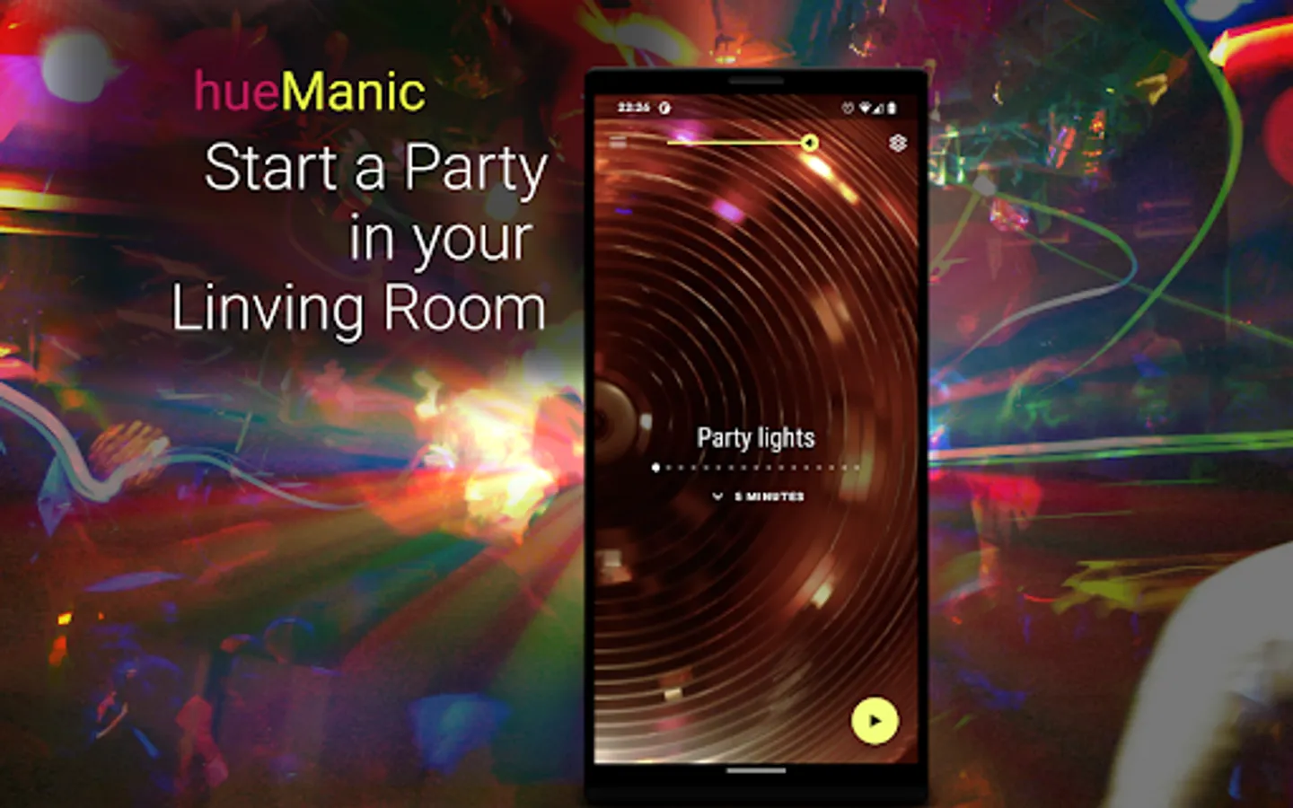 Party lights turn your music into a visual light explosion and makes you living room into a dance floor. Just start Party lights in hueManic and play any of our playlists in any music app you prefer, should it be YouTube, Spotify, Pandora or what so ever.
