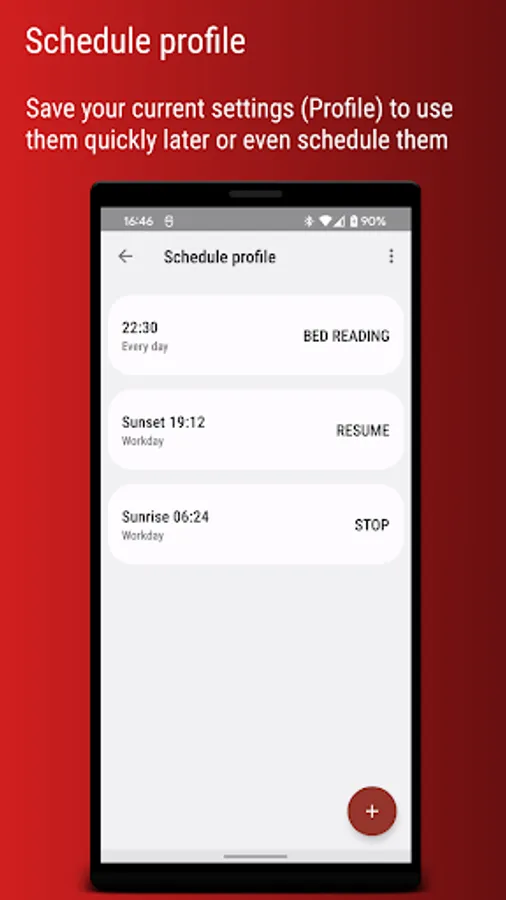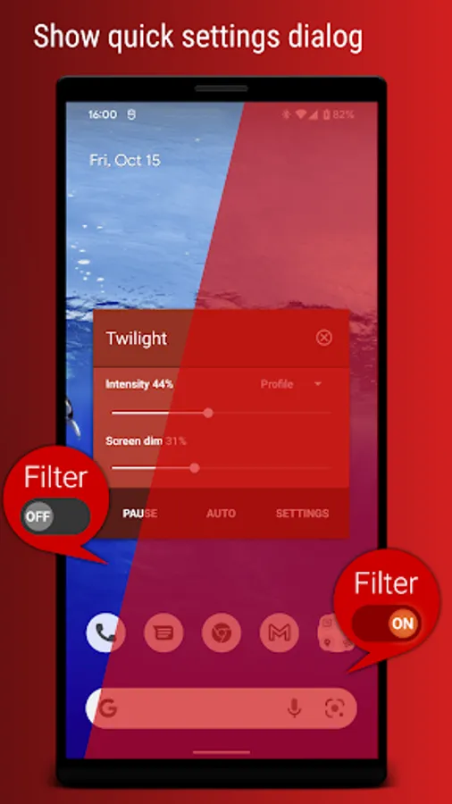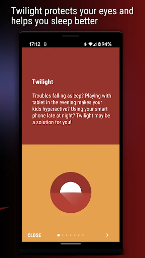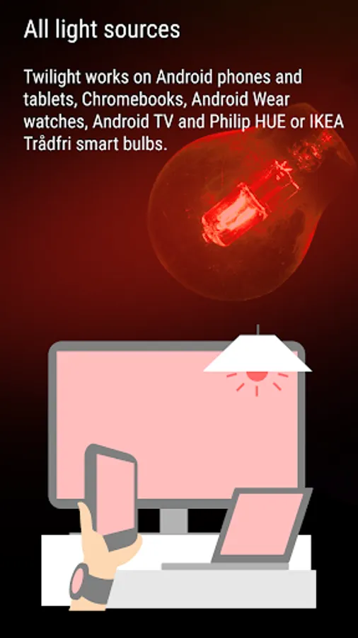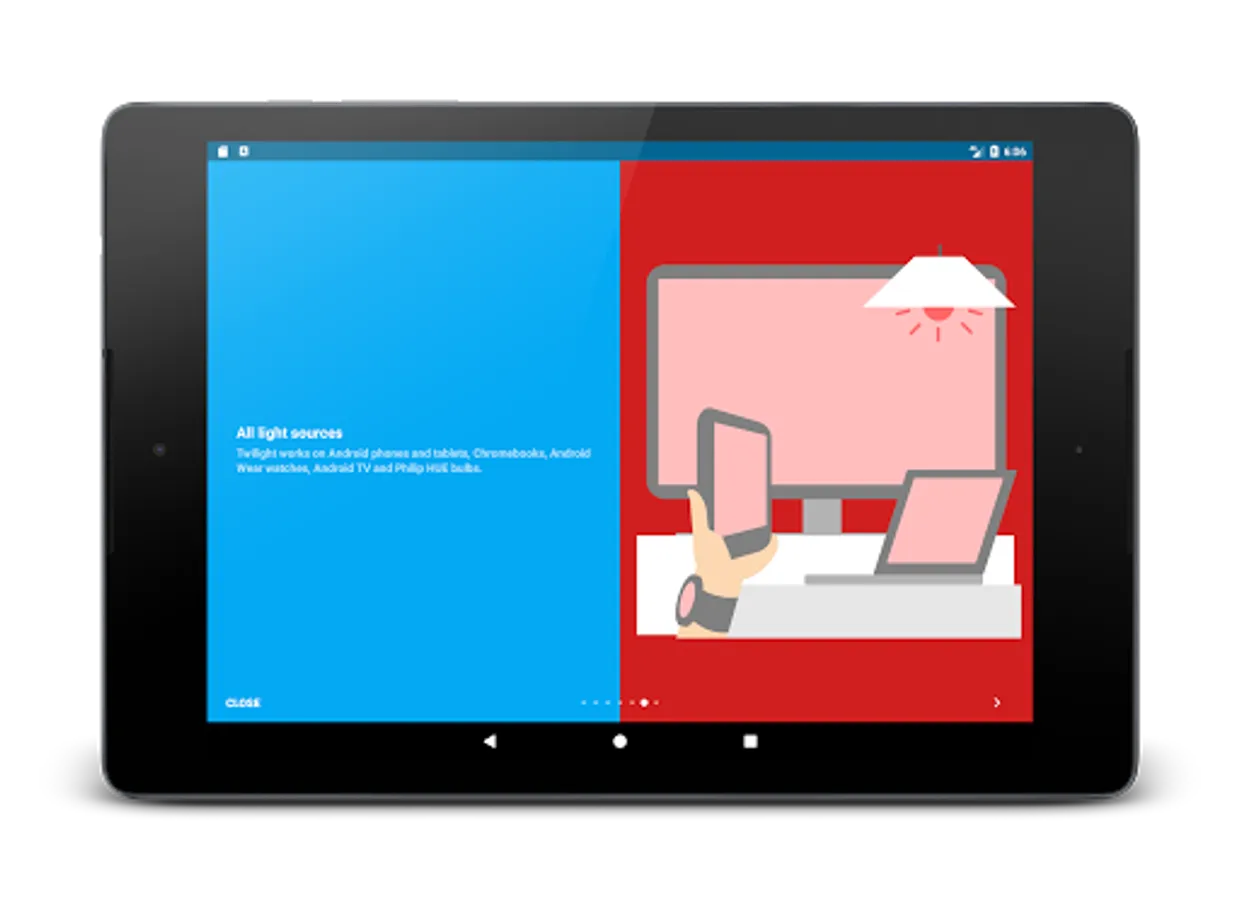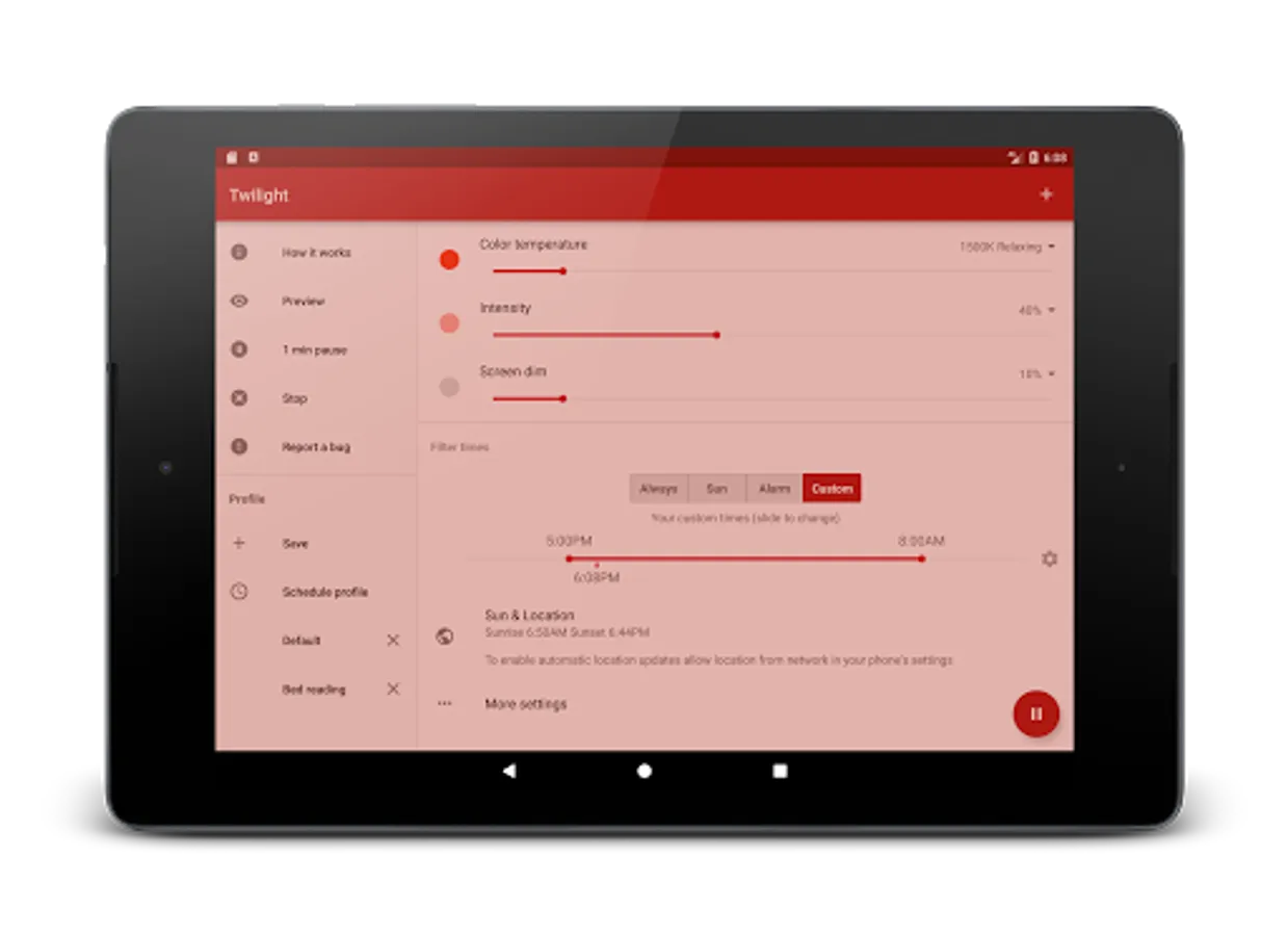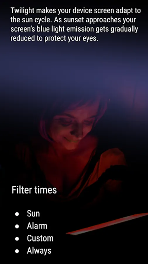 The Twilight app makes your device screen adapt to the time of the day. It filters the blue spectrum on your phone or tablet after sunset and protects your eyes with a soft and pleasant red filter. The filter intensity is smoothly adjusted to the sun cycle based on your local sunset and sunrise times.