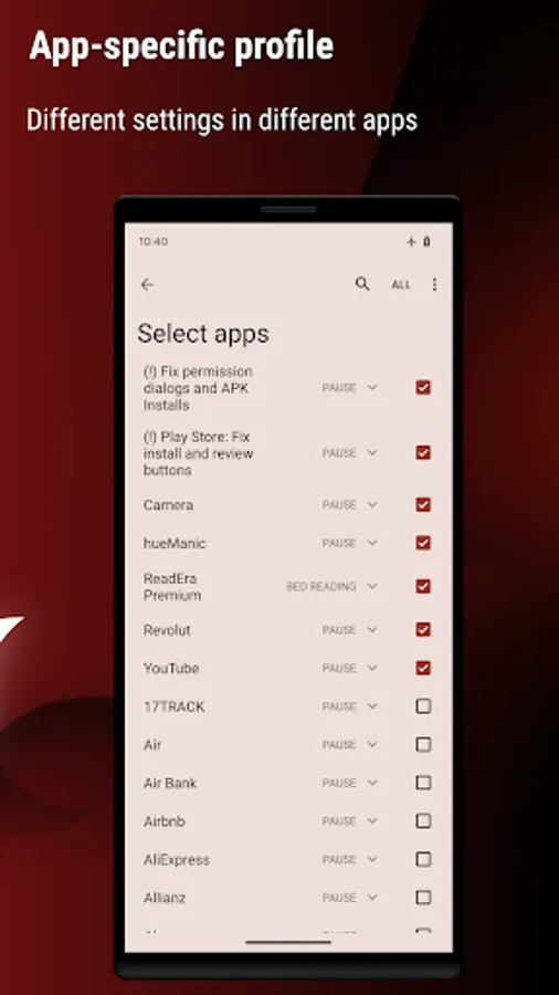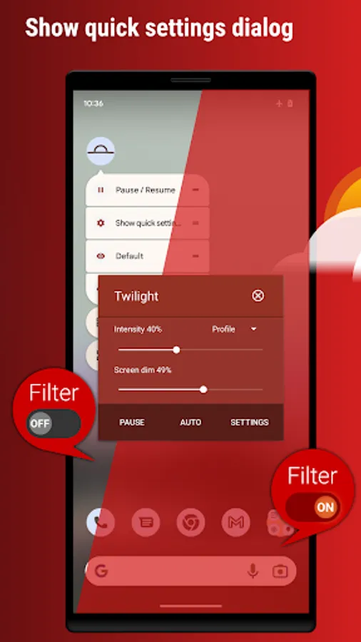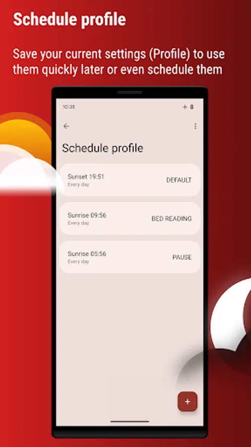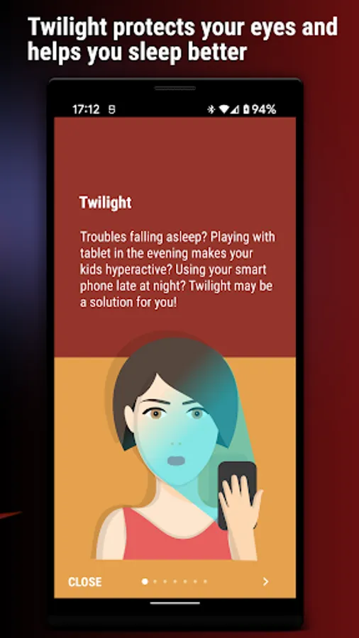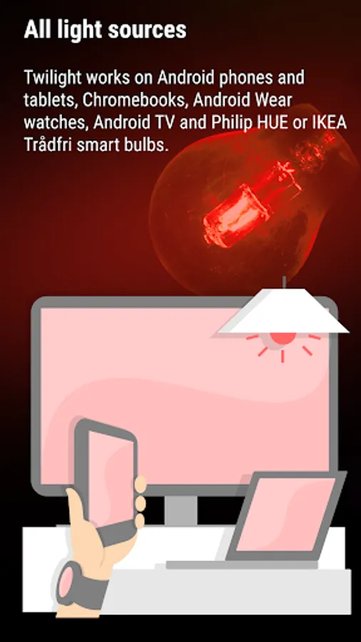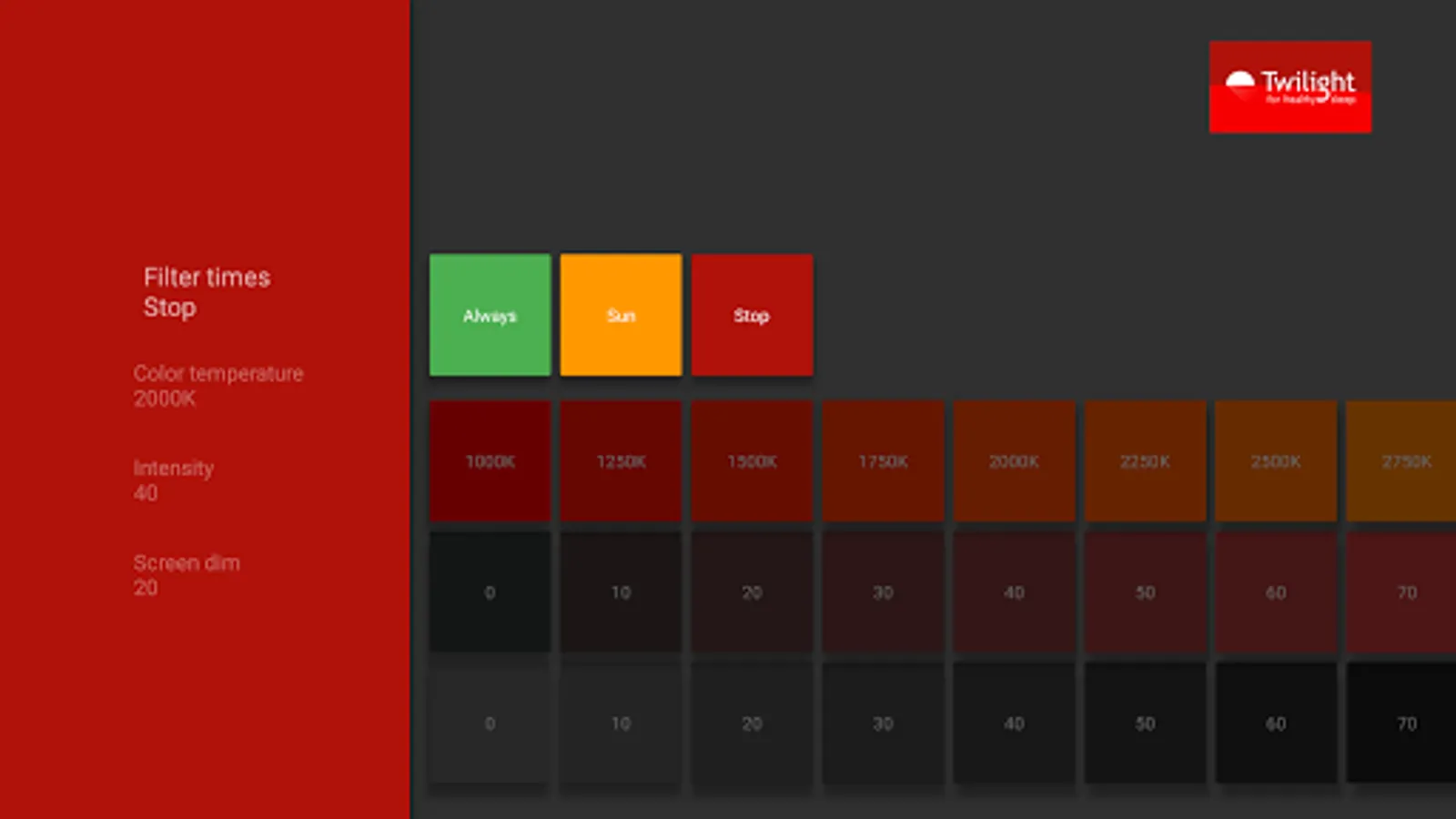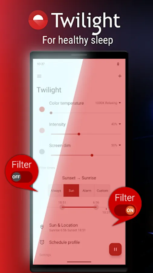 The Twilight app makes your device screen adapt to the time of the day. It filters the flux of blue light emitted by your phone or tablet after sunset and protects your eyes with a soft and pleasant red filter. The filter intensity is smoothly adjusted to the sun cycle based on your local sunset and sunrise times.