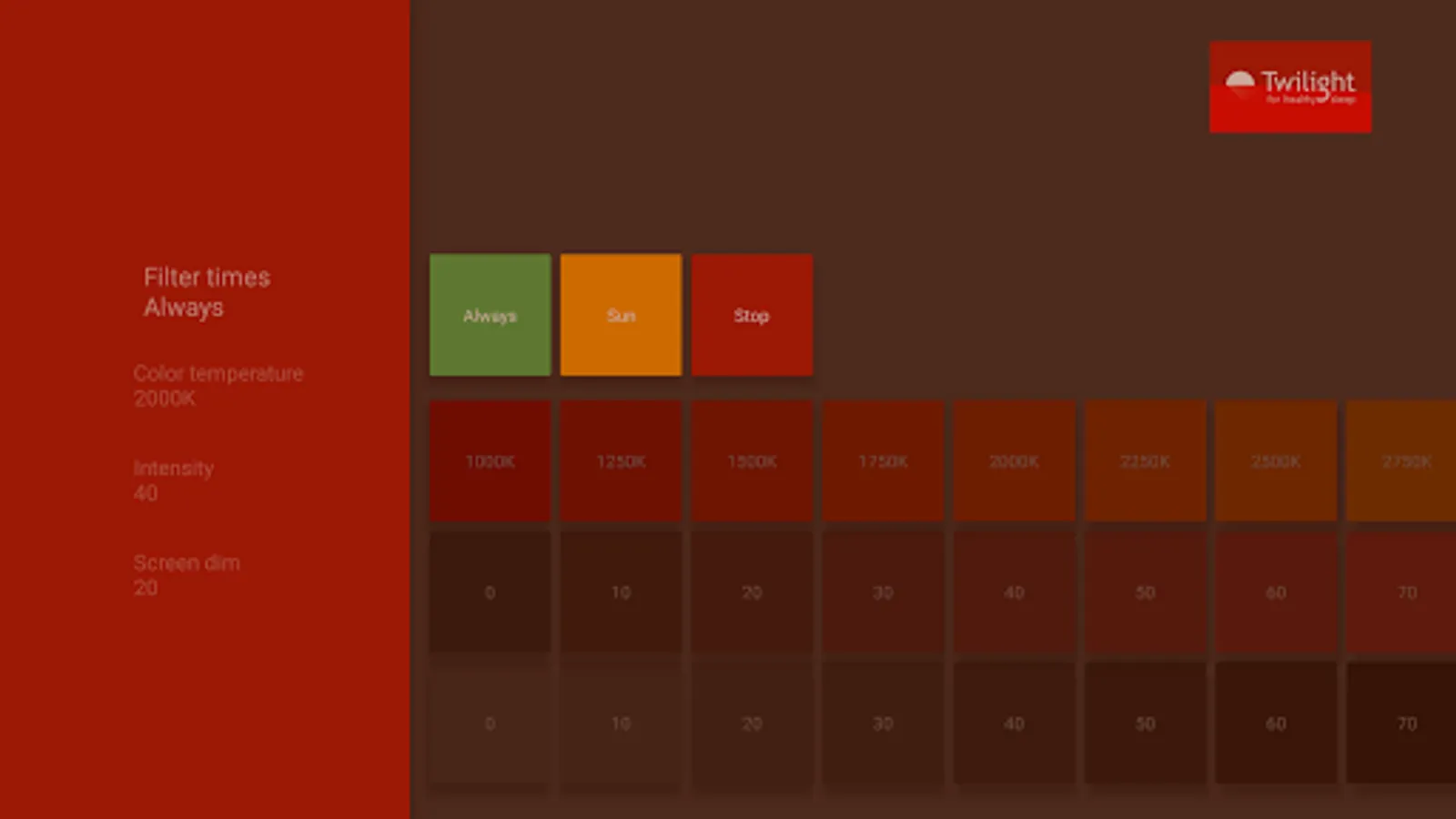2) AMOLED screens: We have tested Twilight on an AMOLED screen for 5 years without any sign of depletion or over-burning. If properly configured Twilight causes less light emission (by enabling dimming) with more equal light distribution (dark areas of the screen such as the status bar get tinted). This may in fact increase your AMOLED screen life time.