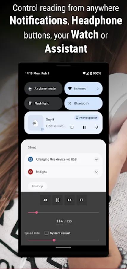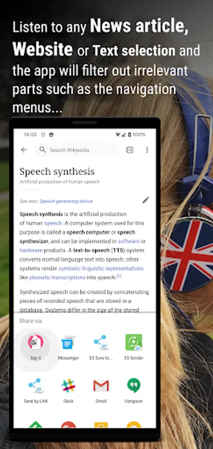 ✓ Listen to any text selection, article or website