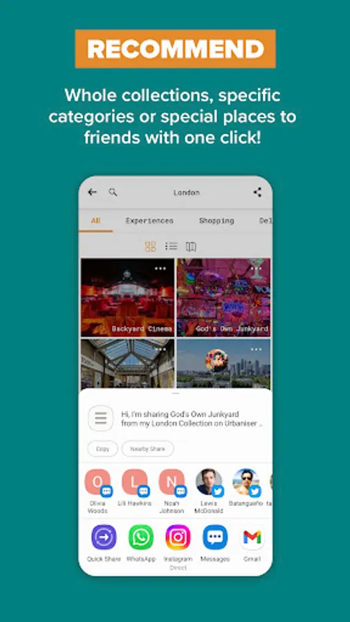 Recommend whole city collections, categories, or individual places with just one click. Next time you get asked for a trendy local dinner idea and your mind goes blank, all your hot spots will be waiting in Urbaniser.