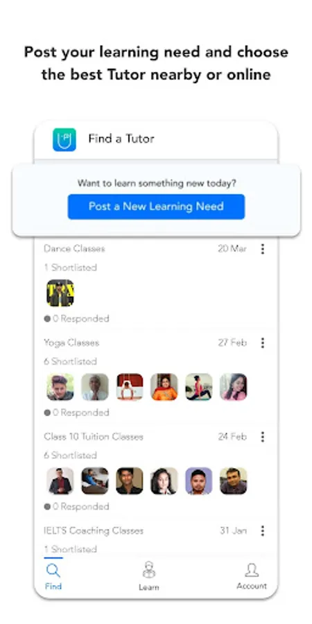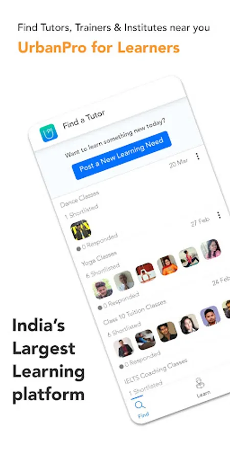 1. Post a learning need: You can post a learning need for any category such as Tuition's (Nursery-KG, Classes 1 to 12, College or University), Hobby Classes (Dance, Vocal Music, Guitar, Yoga, Cooking etc), Languages (Spoken English, French, German, Hindi etc), IT Courses (Microsoft Excel, SAP, Python etc), Exam Prep (UGC NET, UPSC, IIT JEE,