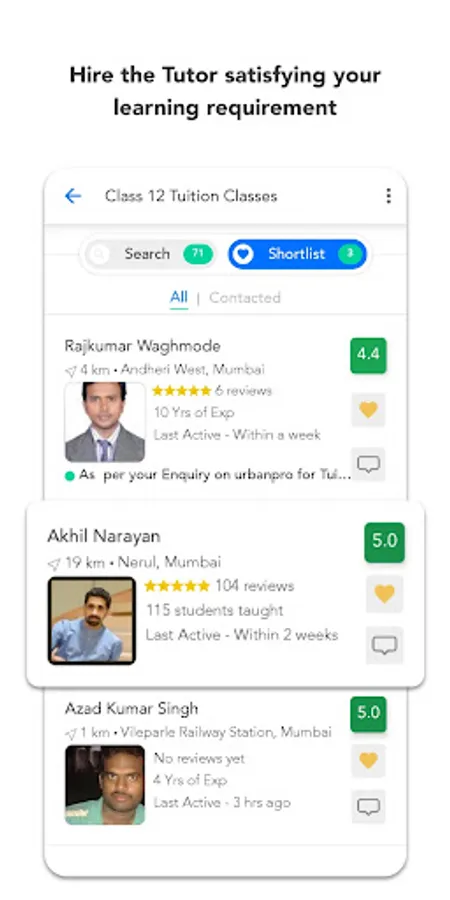 2. Search & Compare: You can browse the profiles of the Tutors and check the experience, availability and reviews shared by their past students. You can also find an UrbanPro Rating (on a scale of 1 to 5) that is a system-generated rating based on the relative popularity of that Tutor in the categories they cater to.