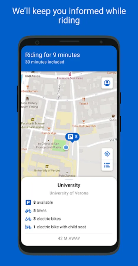 Use the app to find the stations near you and to unlock a bicycle: you can ride up to 2 hours.
