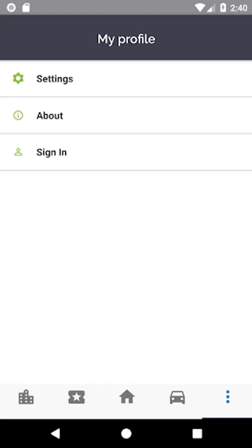"Me" - personal profile (change of dates and profile deletion), application settings, bank cards, payment history, notifications of different types (reminder of an upcoming event or trip, remaining paid parking time), application information.