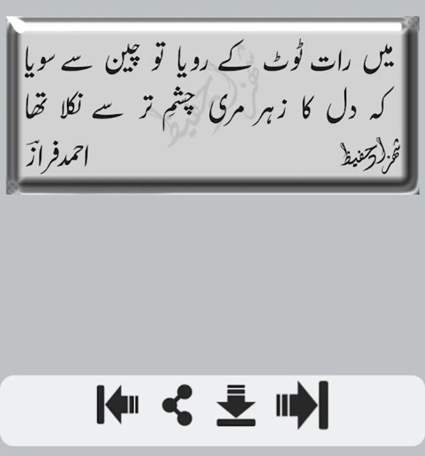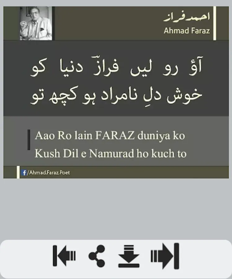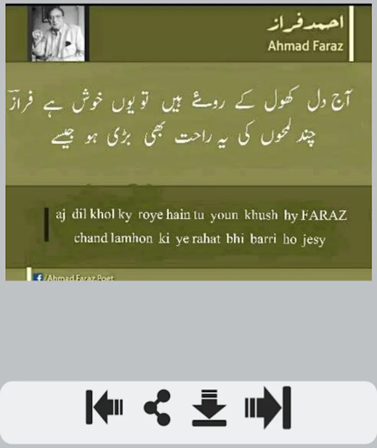We are constantly working hard on making the app better and more useful for you. We need your constant support to get going. Please feel free to email us for any queries/suggestions /problems or if you just want to say hello. If you have enjoyed any feature of the “Urdu Poetry” app, do not forget to rate us on play store and share among your friends.