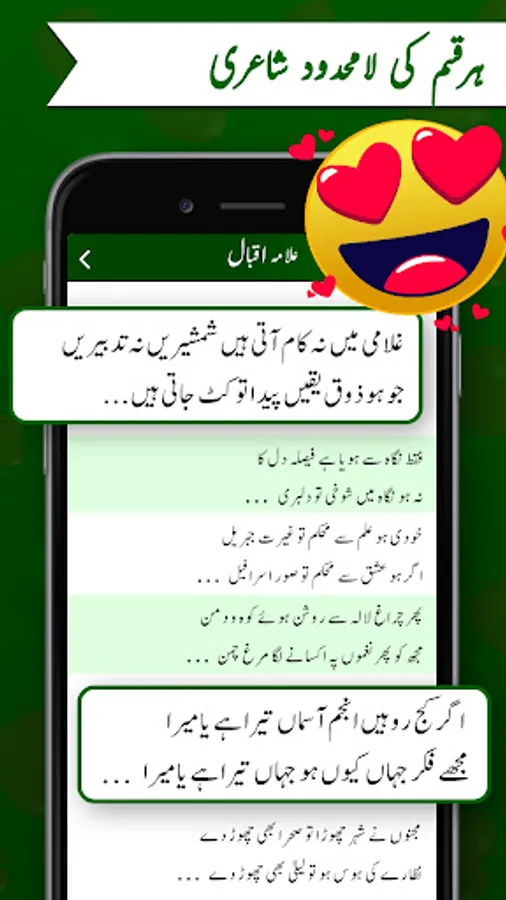 This is the best love poetry in Urdu app for poetry lovers. You can easily share romantic poetry in Urdu with your lovers, and make them emotional with sorry status, romantic status, broken heart quotes, sad status, and miss you quotes. Here you can find love poetry in Urdu, sad poetry in Urdu text, Urdu Shayari love, and attitude poetry in Urdu to share on social media apps. This is the best Urdu Poetry app for poetry on pictures in Urdu.